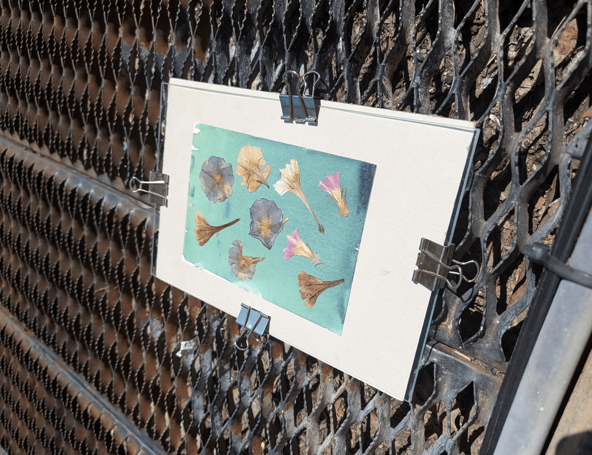 Et puis, rapidement, je me suis rappelé mon envie de simplicité. Alors, voilà une œuvre cyanotype (un nouveau médium pour moi!) avec des fleurs de gloires du matin séchées de mon jardin de l'an passé. Les fleurs sont fragiles, imparfaites, mais étrangement je les trouve ainsi encore plus belles. Je sens la vie aussi fragile que ces fleurs, même si j'ai envie de les garder précieusement dans une image. On voit les coups de pinceaux du bleu, il n'est pas lisse; j'ai besoin qu'on remarque que j'y ai laissé ma marque avec mes gestes. Ces plantes ont grandi sur mon balcon, grimpant sur la façade, créant tranquillement un endroit-refuge m'enveloppant de verdure et de fleurs. Chaque matin était un baume à mes angoisses. C'est là que j'ai envie d'exister.