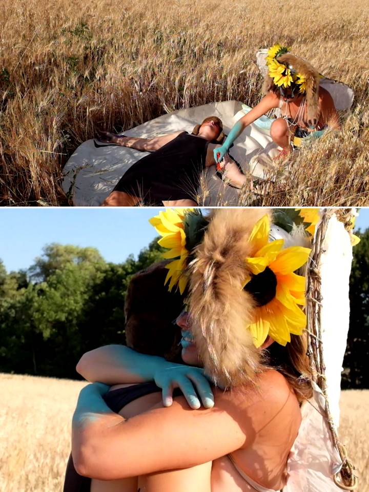 Un gros plan sur un regard maquillé, un dé-zoom qui découvre une personne nue, aux ailes de papillon dont le maquillage est presque inquiétant. Elle s’élance dans un champ de blé, butine, hurle, s’écroule pour laisser place à un personnage prise dans une tornade.