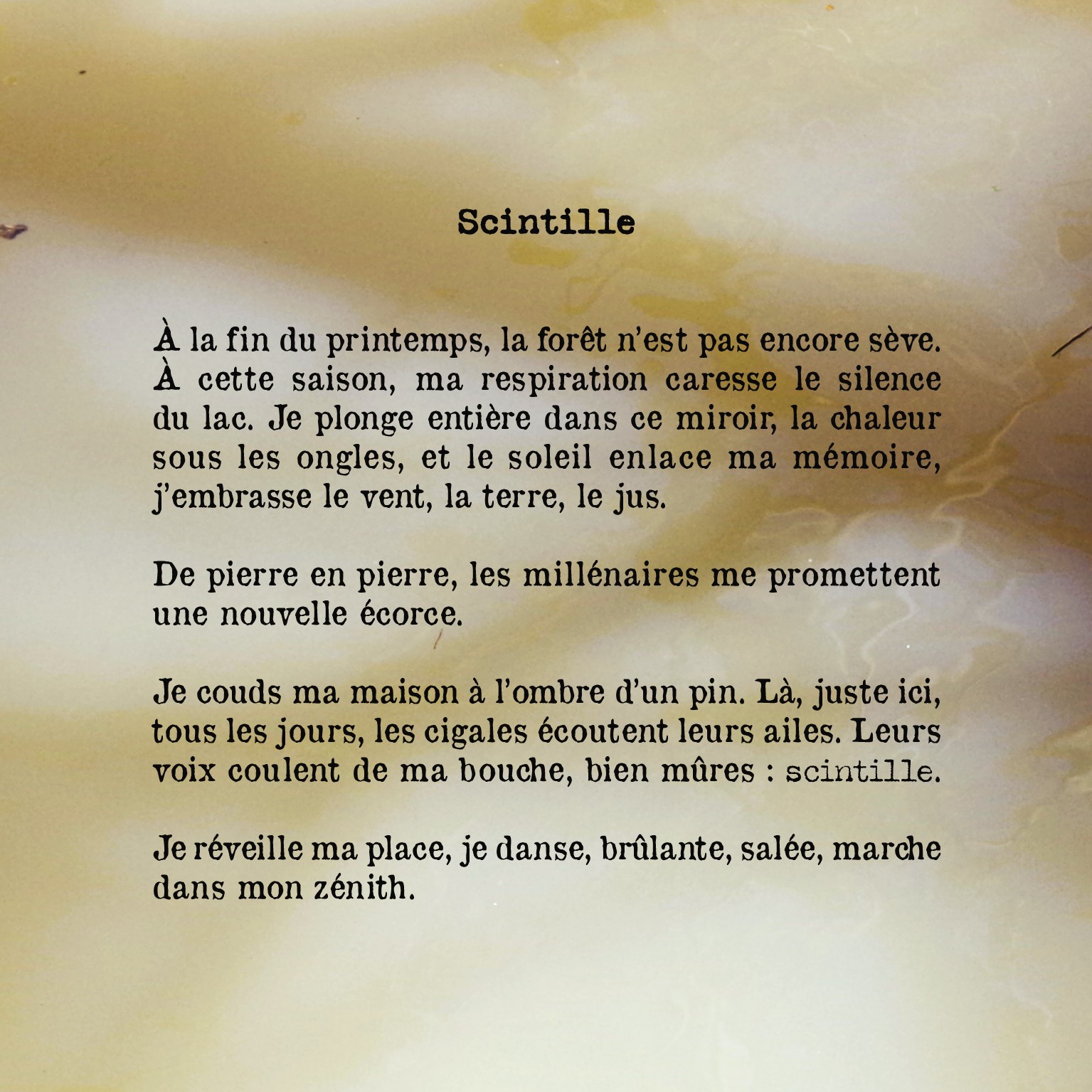 J'ai d'abord noté des dizaines de morceaux de phrases qui me plaisaient dans le texte de Marianne, je les ai écrits sur des bouts de papier, en séparant verbes, substantifs, adverbes, puis j'ai entrepris une sorte de poème-collage, à la fois à l'écoute du hasard et de ce qui me parlait. En est ressorti un poème en prose utilisant une partie des mots. Je m'étais donné comme règle de n'utiliser que les mots de Marianne, et je l'ai respectée. Comme arrière-plan de l'image, j'ai utilisé une photo que j'avais prise au printemps il y a quelques années.