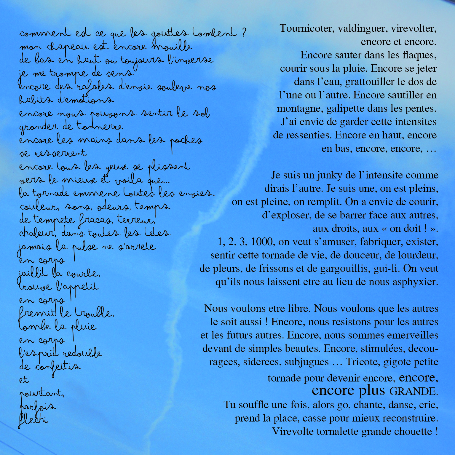 alors voilà, on avait peu de temps (1h devant nous), on a regardé rapidement les œuvres. On a choisi cette vidéo de la jolie fleur des champs qui vit la tornade et on l'a croisé avec un exercice d'écriture de Laura Vazquez. On a pris nos stylos, deux feuilles arrachées du carnet utilisé pendant notre voyage et hop top chrono, 20 min d'écriture directe chacun·e. On se l'ait lu et puis mise en page, oups, oups j'ai repensé au format alors hop j'ai trouvé une vieille photo de nuage, deux typos pour chacun de nos textes et zou voili voilou :)